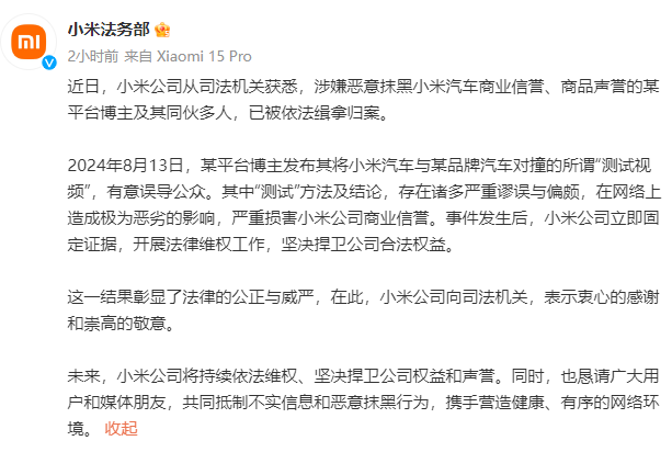 小米法务部在发布的原文中表示,近日,小米公司从司法机关获悉,涉嫌恶意抹黑小米汽车商业信誉、商品声誉的某平台博主及其同伙多人,已被依法缉拿归案。